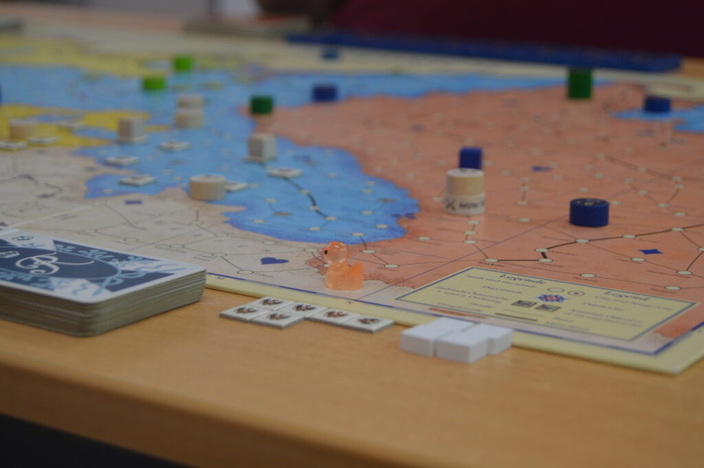 Alberto Romero – champion at the previous CAFE – was playing with Prussia at this table and he had a plan: to concentrate his defense against Austria in Saxony, even to the point that one of the Hanoverian generals made it all the way there with a supporting supply train to reinforce the area. France, led by Arnold de Wijs, took this opportunity to send himself a French general to harass Prussia and provide support to Austria. Andrew Brown, in control of the white pieces, was short on diamonds and no amount of French support allowed him to break Alberto’s defense despite having both subsidy reductions in rounds 11 and 17 as well as a long living Elisabeth. This was finally to the advantage of Jorge – newcomer to the tournament – who fought a relentless attrition and was able to take his last objectives in round 21, right before the death of the Tsarina!